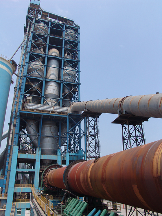 回轉(zhuǎn)窯是由鋼板卷制的圓筒,內(nèi)砌耐火磚,由裝車簡體上的輪帶和下面的托輪支承,用裝在窯身上的大齒圈傳動?;剞D(zhuǎn)窯通常以3.5%的斜度安放,轉(zhuǎn)數(shù)一般在1轉(zhuǎn)/分鐘以內(nèi)、新式干法窯可達3轉(zhuǎn)/分鐘以上。單筒冷卻機與窯相似,不同的是筒內(nèi)裝有揚料板用以加速熟料冷卻。窯頭高溫區(qū)簡體溫度過高,以前曾用水冷卻,現(xiàn)已改為用風(fēng)冷卻。