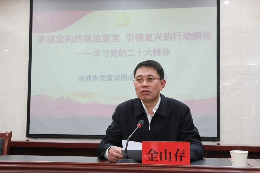 近日,深入推進學習宣傳貫徹黨的二十大精神在鵬飛集團蔚然成風,12月7日下午,南通市委宣講團成員,南通市委黨校副校長、教授趙園園走進鵬飛,來公司開展學習貫徹黨的二十大精神專題宣講,進一步引導鵬飛人把思想和行動統(tǒng)一到黨的二十大精神上來。鵬飛集團在新征程上用黨的創(chuàng)新理論武裝頭腦、指導實踐、推動工作,更好地“扛起新使命、譜寫新篇章”,以實際行動和過硬成果推動黨的二十大精神落地見效。大公鎮(zhèn)黨委書記金山存、黨委副書記閻超、宣傳委員徐譯,鵬飛集團黨委書記、董事長王家安等認真聽取了宣講內(nèi)容,經(jīng)發(fā)局全體人員、鵬飛集團全體負責人、工人代表等參加專題學習。