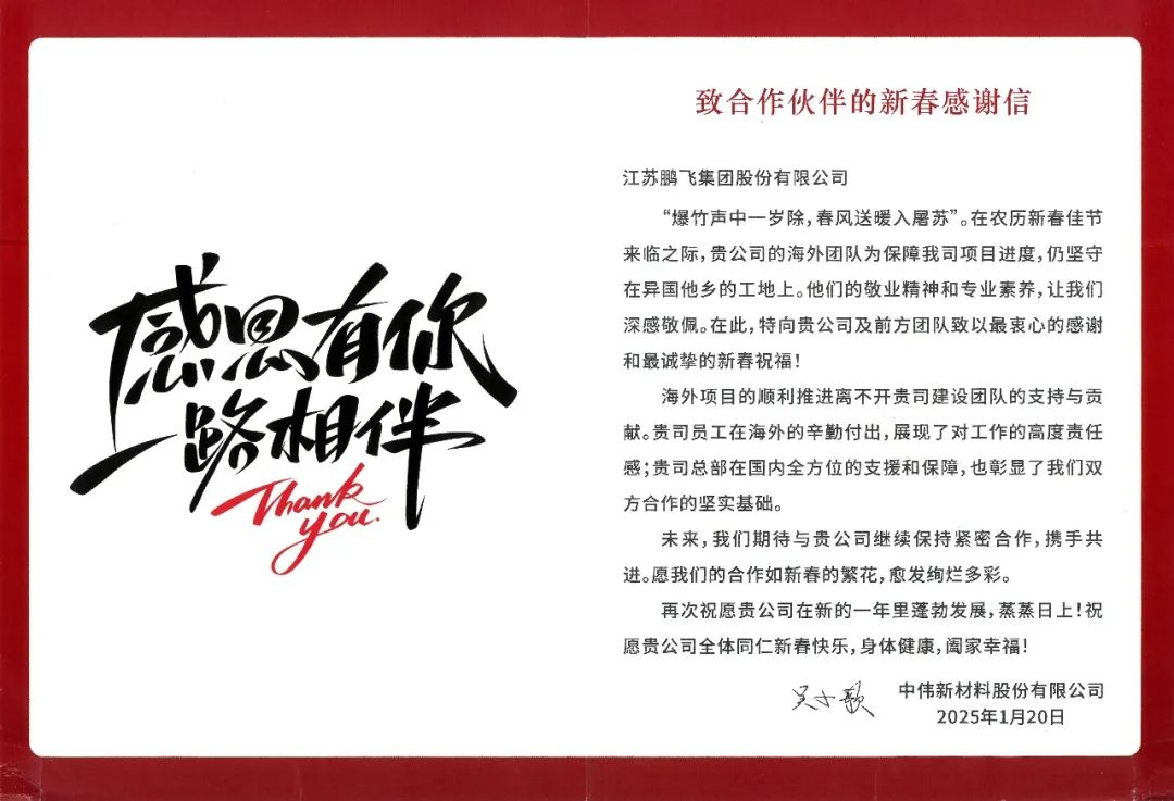 江蘇鵬飛集團(tuán)在項(xiàng)目履約中用行動(dòng)做到客戶滿意,以優(yōu)質(zhì)履約作為品牌支撐,收到來自客戶的感謝信。信中,客戶對(duì)我司交付的項(xiàng)目質(zhì)量和效率表達(dá)了高度肯定和認(rèn)可,更對(duì)鵬飛項(xiàng)目負(fù)責(zé)團(tuán)隊(duì)的認(rèn)真負(fù)責(zé)態(tài)度、專業(yè)技術(shù)能力、高效執(zhí)行能力給予了高度的評(píng)價(jià)和贊賞。