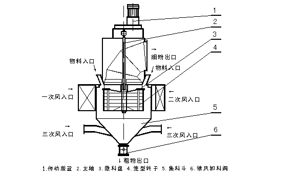 由傳動(dòng)裝置、回轉(zhuǎn)部分(主軸、撒料盤(pán)、轉(zhuǎn)子等),機(jī)殼(內(nèi)筒、導(dǎo)向葉片、內(nèi)錐體、外筒、外錐體、進(jìn)風(fēng)口、加料口、兩個(gè)粗粉出口等),細(xì)粉收集裝置(四個(gè)旋風(fēng)筒等)組成。