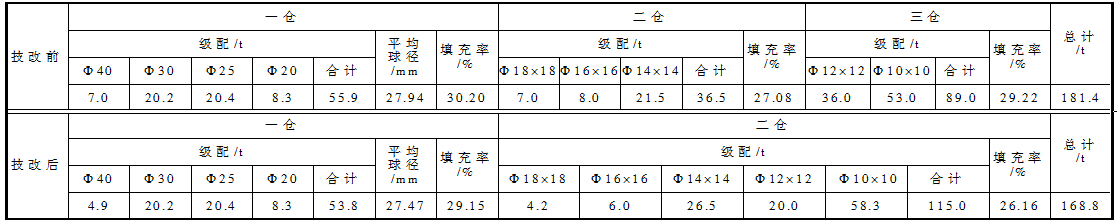 經(jīng)多次考察并做篩余曲線和顆粒級(jí)配分析后決定,將磨機(jī)二、三倉(cāng)合并,原一倉(cāng)倉(cāng)長(zhǎng)3.7m,二倉(cāng)倉(cāng)長(zhǎng)2.7m,三倉(cāng)倉(cāng)長(zhǎng)6.1m,改造后一倉(cāng)倉(cāng)長(zhǎng)3.7m,二倉(cāng)倉(cāng)長(zhǎng)8.8m,同時(shí)調(diào)整研磨體平均球徑及填充率,技改前后研磨體級(jí)配對(duì)比見(jiàn)表2。