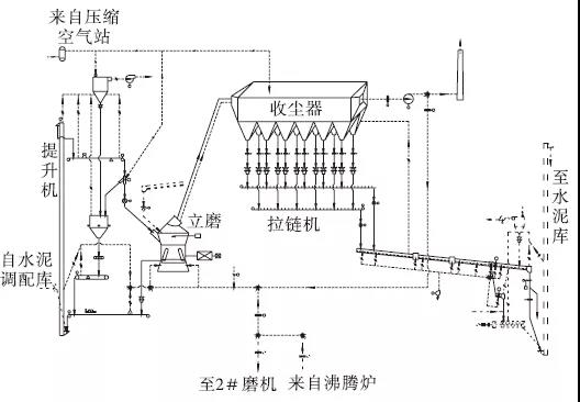 生產(chǎn)P·O42.5水泥時(shí)工藝流程是:熟料、石膏、石灰石、粉煤灰、礦渣等物料經(jīng)輸送設(shè)備輸送至各配料倉(cāng),粉煤灰從粉煤灰?guī)煜陆?jīng)輸送設(shè)備進(jìn)入生產(chǎn)系統(tǒng)。各種物料按一定比例設(shè)定,分別經(jīng)各定量給料機(jī)和輸送設(shè)備送至入磨鎖風(fēng)閥后入磨。入磨物料在磨內(nèi)進(jìn)行烘干和粉磨,粉磨后的物料經(jīng)選粉機(jī)分離,粗粉返回磨盤重新粉磨,合格細(xì)粉隨氣流直接進(jìn)入袋式收塵器進(jìn)行收集,收集下來(lái)的成品經(jīng)空氣斜槽、斗式提升機(jī)等輸送設(shè)備入水泥庫(kù)儲(chǔ)存;立磨吐渣經(jīng)輸送設(shè)備(設(shè)有除鐵器)進(jìn)入循環(huán)斗式提升機(jī),提升入磨后繼續(xù)粉磨。沸騰爐提供的熱風(fēng)與循環(huán)風(fēng)、冷風(fēng)混合后進(jìn)入磨內(nèi),磨內(nèi)混合風(fēng)起到烘干和提升物料的作用,出磨氣流進(jìn)入布袋收塵器;出布袋收塵器的氣體經(jīng)循環(huán)風(fēng)機(jī)后一部分經(jīng)循環(huán)風(fēng)管,作為循環(huán)風(fēng)入磨,其余氣體經(jīng)煙囪排入大氣。系統(tǒng)工藝流程見(jiàn)圖1。