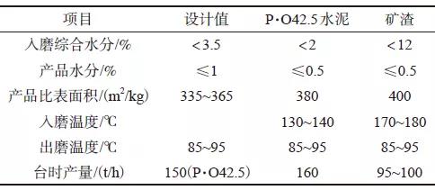 JLMS-46.4立磨主要技術(shù)參數(shù)見(jiàn)表1,水泥與礦渣主要工藝參數(shù)見(jiàn)表2。