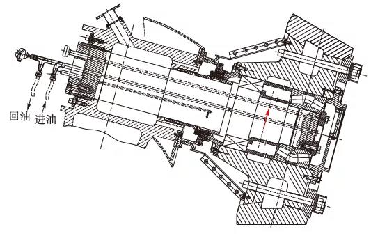 磨輥軸承潤滑是通過集中潤滑系統(tǒng)來實現的,通過稀油站向磨輥內部供油,油品為460#極壓工業(yè)齒輪油。磨輥裝置結構及潤滑油走向如圖1所示。
