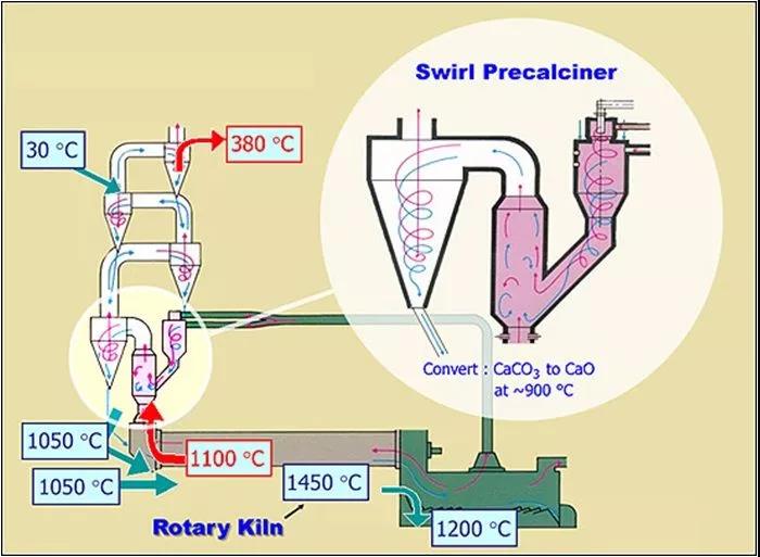 • 生料粉在旋風預熱器系統(tǒng)中與高溫熱氣在懸浮狀態(tài)下進行熱交換。