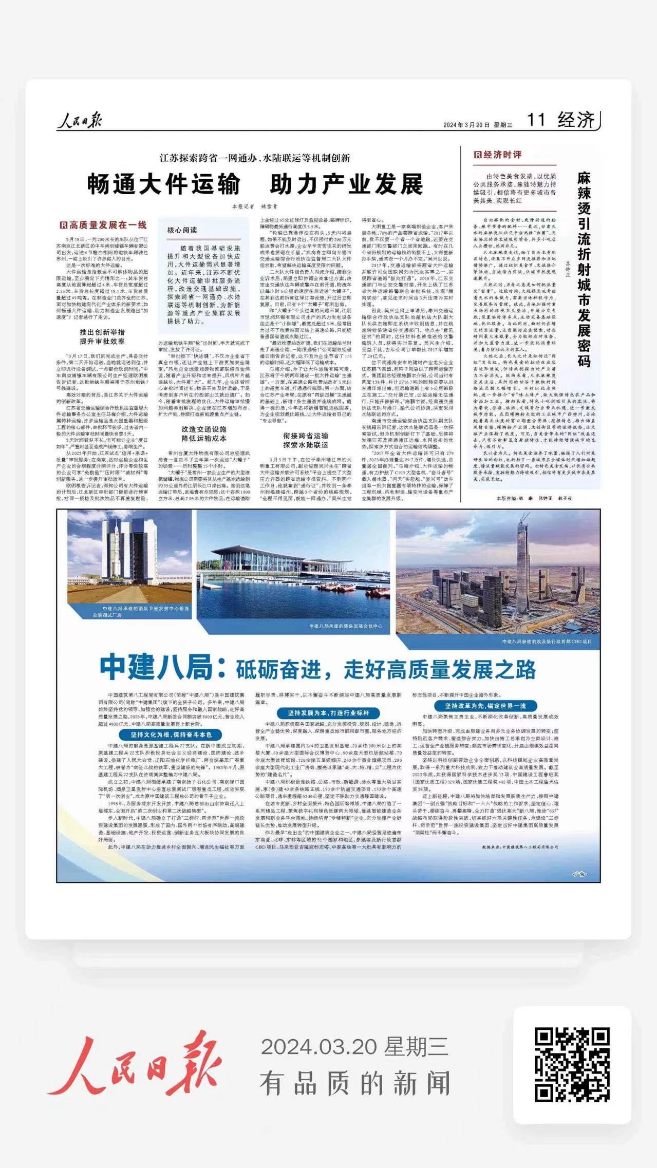 隨著我國基礎(chǔ)設(shè)施提升和大型設(shè)備加快應(yīng)用,大件運輸需求顯著增加。近年來,江蘇不斷優(yōu)化大件運輸審批服務(wù)流程,改造交通基礎(chǔ)設(shè)施,探索跨省一網(wǎng)通辦、水陸聯(lián)運等機(jī)制創(chuàng)新,為新能源等重點產(chǎn)業(yè)集群發(fā)展提供了助力。3月18日,一列200米長的車隊從位于江蘇南京江北新區(qū)的中車南京浦鎮(zhèn)車輛有限公司出發(fā),運送6節(jié)橙白相間的地鐵車廂駛往蘇州,一路上吸引了許多路人的目光。這是一次標(biāo)準(zhǔn)的大件運輸。大件運輸是指載運不可解體物品的超限運輸,至少滿足下列情形之一:其車貨總高度從地面算起超過4米、車貨總寬度超過2.55米、車貨總長度超過18.1米、車貨總質(zhì)量超過49噸等。在制造業(yè)門類齊全的江蘇,面對加快構(gòu)建現(xiàn)代化產(chǎn)業(yè)體系的新要求,如何暢通大件運輸、助力制造業(yè)發(fā)展跑出“加速度”?記者進(jìn)行了走訪。推出創(chuàng)新舉措提升審批效率 “3月17日,我們剛完成生產(chǎn)、具備交付條件,第二天開始運送,當(dāng)晚就運送到位,并立即進(jìn)行設(shè)備調(diào)試,一點都沒耽誤時間。”中車南京浦鎮(zhèn)車輛有限公司生產(chǎn)經(jīng)理歐明根告訴記者,這批地鐵車廂將用于蘇州地鐵7號線建設(shè)?! 「咝拥谋澈螅墙K關(guān)于大件運輸?shù)膭?chuàng)新改革?! 〗K省交通運輸綜合行政執(zhí)法監(jiān)督局大件運輸事務(wù)辦公室主任馬梅介紹,大件運輸屬特種運輸,許多運輸品是大國重器和超級工程的核心部件,審批環(huán)節(jié)較多,過去省內(nèi)一般的大件運輸審批時間最快也要3天?! ?天時間看似不長,但可能讓企業(yè)“度日如年”,嚴(yán)重時甚至造成產(chǎn)線停工,影響生產(chǎn)?! ?023年開始,江蘇試點“信用+承諾+批量”審批服務(wù);在南京,還對運輸企業(yè)和生產(chǎn)企業(yè)的合規(guī)程度分別評分,評分等級較高的企業(yè)可享“免勘驗”“壓時限”“減材料”等創(chuàng)新服務(wù),進(jìn)一步提升審批效率。 歐明根告訴記者,得知公司有大件運輸?shù)挠媱澓?,江北新區(qū)審批部門提前進(jìn)行預(yù)審批,對同一規(guī)格及批次物品不再重復(fù)勘驗,為運輸?shù)罔F車廂“搶”出時間,半天就完成了審批,發(fā)放了許可證?!?ldquo;審批按下‘快進(jìn)鍵’,不僅為企業(yè)省下真金白銀,還讓產(chǎn)業(yè)鏈上下游更加安全穩(wěn)定。”風(fēng)電企業(yè)遠(yuǎn)景能源物流部聯(lián)絡(luò)員金煒說,隨著產(chǎn)業(yè)升級和功率提升,風(fēng)機(jī)葉片越造越長,大件更“大”。前幾年,企業(yè)還曾擔(dān)心審批時間過長,物品不能及時運輸,于是考慮到客戶所在的西部山區(qū)就近建廠。如今,隨著審批流程的優(yōu)化,大件運輸審批慢的問題得到解決,企業(yè)便在江蘇增加布點、擴(kuò)大產(chǎn)能,持續(xù)打造新能源重點產(chǎn)業(yè)鏈。 改造交通設(shè)施 降低運輸成本 常州臺廈大件物流有限公司總經(jīng)理武海青一直忘不了去年第一次運送“大罐子”的場景——歷時整整15個小時?!?ldquo;大罐子”是常州一家企業(yè)生產(chǎn)的大型液氮儲罐,物流公司需要將其從生產(chǎn)基地運輸?shù)郊s35公里外的江陰長江口岸出海。接到這筆運輸訂單后,武海青有點犯愁:這個容積1000立方米、總高7.05米的大件物品,在運輸?shù)缆飞蠒?jīng)過65處紅綠燈及監(jiān)控設(shè)備、路牌標(biāo)識,障礙物最低通行高度僅5.5米?!?ldquo;輪船已靠港停泊在碼頭,5天內(nèi)將啟程,如果不能及時運出,不僅預(yù)付的300萬元船運費會打水漂,企業(yè)辛辛苦苦攻關(guān)的研發(fā)成果也要砸在手里。”武海青立即向無錫市交通運輸綜合行政執(zhí)法監(jiān)督局二大隊大件組求助,希望解決運輸高度受限的問題。 二大隊大件組負(fù)責(zé)人馮虎介紹,接到企業(yè)訴求后,局里立即協(xié)調(diào)會商拿出方案,決定由交通執(zhí)法車輛或警車在前開道,物流車以每小時5公里的速度在后運送“大罐子”,在其到達(dá)前拆卸紅綠燈等設(shè)施,開過后立即復(fù)原。目前,已有9個“大罐子”順利出海?! 『?ldquo;大罐子”個頭過高的問題不同,江陰市恒潤環(huán)鍛有限公司生產(chǎn)的風(fēng)力發(fā)電設(shè)備法蘭是個“小胖墩”,最寬處超過5米,經(jīng)常因為過不了收費站而無法上高速公路,只能經(jīng)普通國省道或水路過江。 “最近收費站改擴(kuò)建,我們在運輸法蘭時走了高速公路,一路很通暢!”公司副總經(jīng)理潘云剛告訴記者,這不但為企業(yè)節(jié)省了1/5的運輸時間,還大幅降低了運輸成本。 馬梅介紹,為了讓大件運輸有路可走,江蘇將于今明兩年建設(shè)一批大件運輸“主通道”:一方面,在高速公路收費站改擴(kuò)5米以上的超寬車道,打通通行瓶頸;另一方面,結(jié)合江蘇產(chǎn)業(yè)布局,在原有“兩縱四橫”主通道的基礎(chǔ)上,新增7條主通道并連線成網(wǎng)。值得一提的是,今年還將新增智能選線服務(wù),為企業(yè)規(guī)劃最優(yōu)路線,讓大件運輸有自己的“專業(yè)導(dǎo)航”?! °暯涌缡∵\輸 探索水陸聯(lián)運 3月5日下午,在位于泰州靖江市的大明重工有限公司,副總經(jīng)理吳興生在“跨省大件運輸并聯(lián)許可系統(tǒng)”平臺上提交了大型壓力容器的跨省運輸申報資料。不到兩