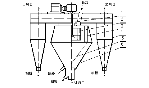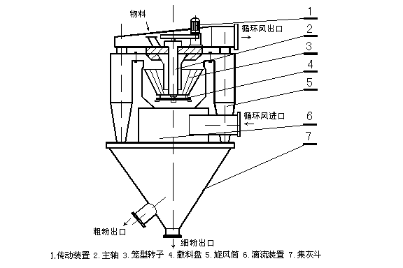由傳動(dòng)裝置、回轉(zhuǎn)部分(主軸、撒料盤(pán)、轉(zhuǎn)子等),機(jī)殼(內(nèi)筒、導(dǎo)向葉片、內(nèi)錐體、外筒、外錐體、進(jìn)風(fēng)口、加料口、兩個(gè)粗粉出口等),細(xì)粉收集裝置(四個(gè)旋風(fēng)筒等)組成。