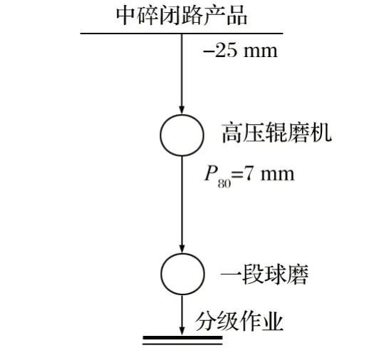 /d 生產(chǎn)系統(tǒng)設(shè)備陳舊,且設(shè)備規(guī)格小、數(shù)量多,管理和維護(hù)工作量大,因此擬對(duì)碎磨流程進(jìn)行技術(shù)升級(jí)改造。通過(guò)初步調(diào)研和分析,擬采用高壓輥磨機(jī)進(jìn)行碎磨系統(tǒng)改造,實(shí)現(xiàn)單系列生產(chǎn)能力達(dá)到 10 000 t