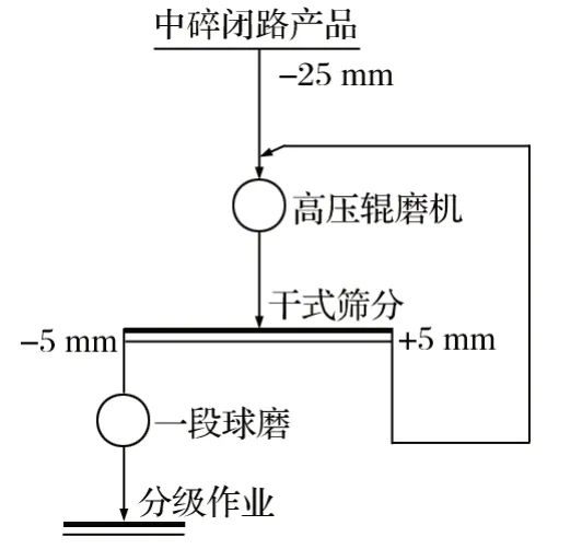 該鉬礦結(jié)合多年現(xiàn)場(chǎng)生產(chǎn)實(shí)踐,選取有代表性礦樣進(jìn)行試驗(yàn)。礦樣由硬礦、中等硬度礦和軟礦組成,根據(jù)地質(zhì)模型和采礦排產(chǎn)計(jì)劃,3 種礦樣按比例4∶4∶2 進(jìn)行配礦。對(duì)配好礦樣進(jìn)行 3 種高壓輥磨工藝流程的試驗(yàn)研究,獲得其產(chǎn)品粒度和邦德功指數(shù)參數(shù)。實(shí)驗(yàn)室采用 1 臺(tái) CLM25