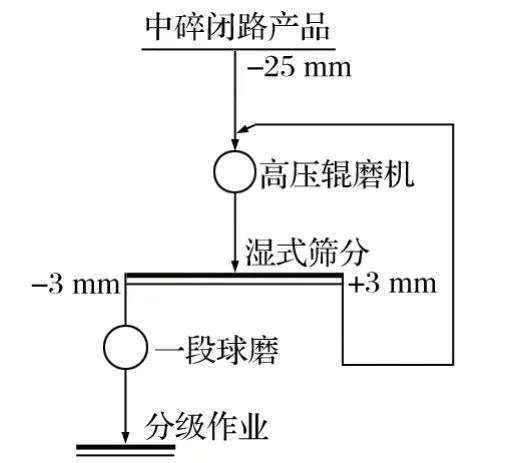 該鉬礦選礦廠從建成投產(chǎn)以來(lái),處理礦石的性質(zhì)變化較大,經(jīng)常導(dǎo)致破碎和磨礦系統(tǒng)處理能力波動(dòng),當(dāng)處理難碎磨礦石時(shí),系統(tǒng)處理能力低,襯板磨損嚴(yán)重。借鑒其他鉬礦選礦廠技術(shù)改造的生產(chǎn)實(shí)踐經(jīng)驗(yàn),在三段一閉路流程后引入高壓輥磨機(jī)作為超細(xì)碎設(shè)備降低入磨粒度,提高系統(tǒng)整體碎磨能力。根據(jù)大量的文獻(xiàn)報(bào)道,有色金屬選礦廠高壓輥磨生產(chǎn)實(shí)踐選用3 種典型工藝流程,如圖 1~ 3 所示。結(jié)合本項(xiàng)目特點(diǎn),高壓輥磨機(jī)入料粒度為 -25 mm。