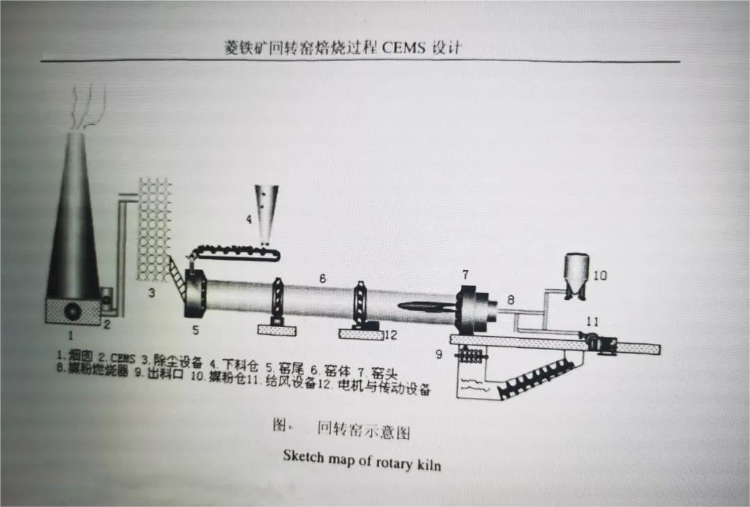 (1)氣體路線分析:氣體是從搖頭燃燒器輸入的,煤粉在一二次給風(fēng)的燃燒下變成了氣體,其中包括 CO、CO2和原空氣中的N2、O2等氣體 。同時(shí)菱鐵礦在燃燒帶分解出CO、CO2、SO2等氣體。孰料的出料通過水冷,故水蒸氣是少不了的。由于氣流是高溫高速流動的,氣體中含有大量的粉塵,氣體上游到窯尾,給不斷翻滾的物料預(yù)熱,并脫去料石中的水分。接下來就進(jìn)入水冷設(shè)備和除塵設(shè)備,通過冷水套中的冷水逆流來降溫,從而去除大量水分。緊接著在旋風(fēng)除塵中離心作用出去大量的大顆粒塵粒。然后再利用布袋除塵器中的布袋細(xì)孔過濾大量的小顆粒,達(dá)到除塵的目的,最后經(jīng)煙囪排出 。