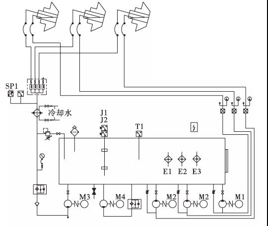 立磨潤滑系統(tǒng)原理如圖2所示,磨輥潤滑系統(tǒng)工作原理為:潤滑系統(tǒng)工作時,油液經供油泵從油箱抽出,經過濾器、冷卻器、分流器等進入磨輥內部,經循環(huán)潤滑換熱后,由回油泵從磨內強制抽出,送回油箱,潤滑系統(tǒng)通過循環(huán)往復實現磨輥的潤滑功能。單個磨輥供油泵分配流量為13 L/min,單輥配置一個能力為20 L/min的回油泵強制回油。
